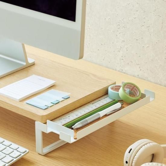 文具小物やガジェットが置けるサイドトレー付きの机上台